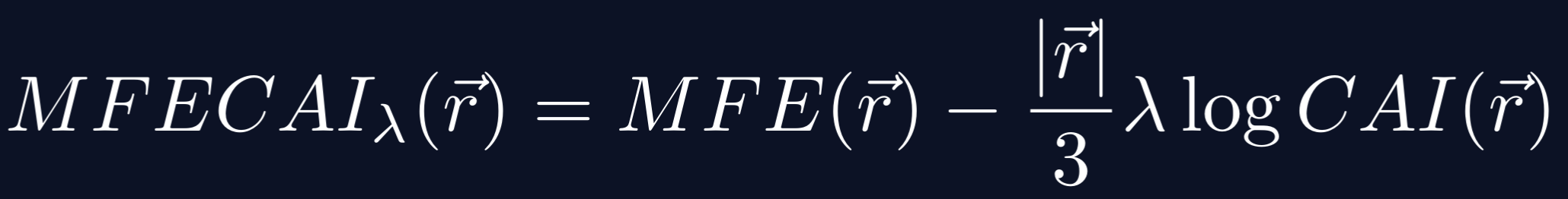 The hyperparameter lambda controls the relative weight given to MFE vs. CAI. A value of 0 means we’re minimizing MFE alone, while larger values of lambda prioritize maximizing CAI. The logarithmic scaling, as well as normalization by the codon sequence length, ensures that the two terms are dimensionally comparable.
